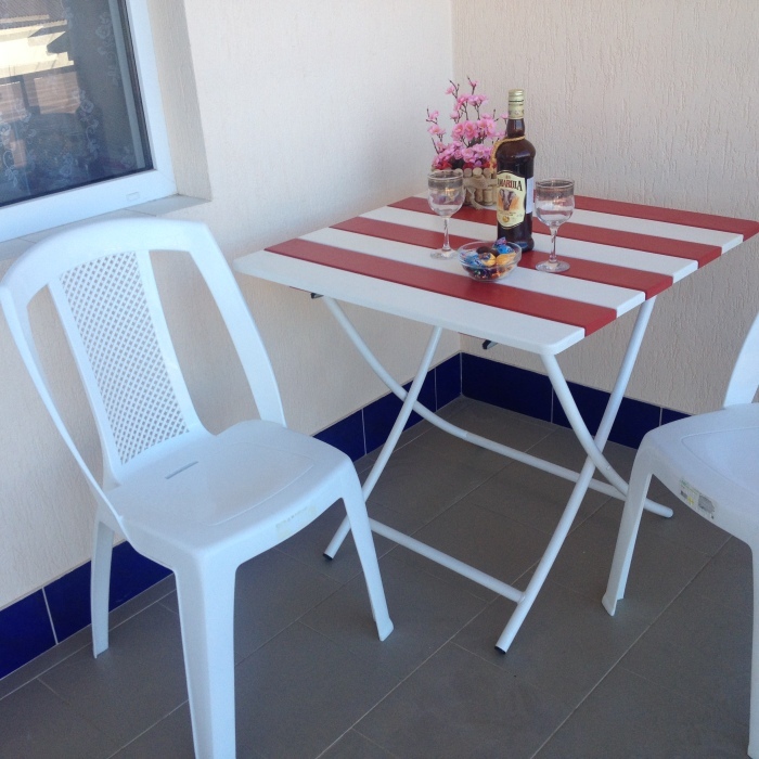 *Огромный балкон со столиком, креслами и видом на море.