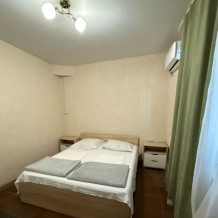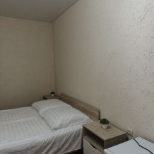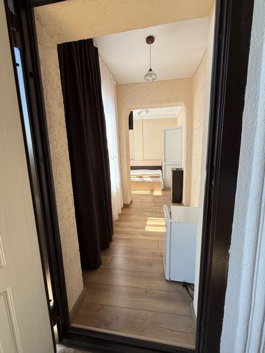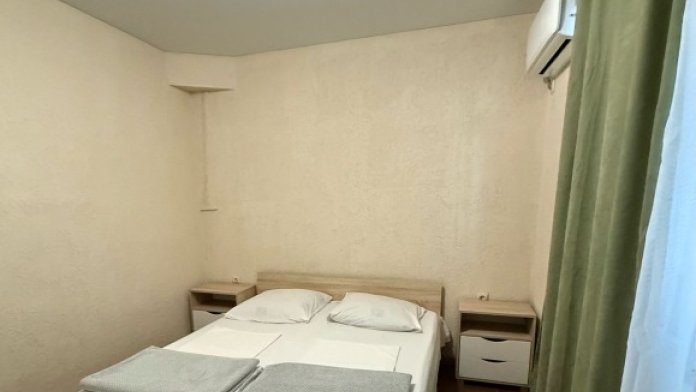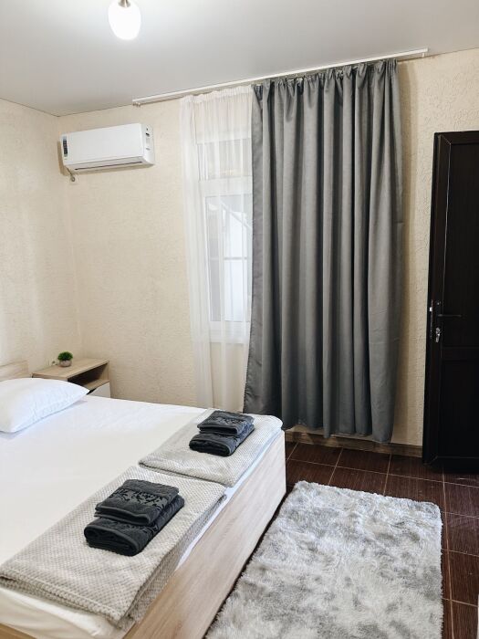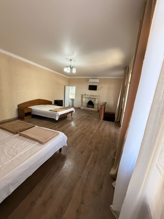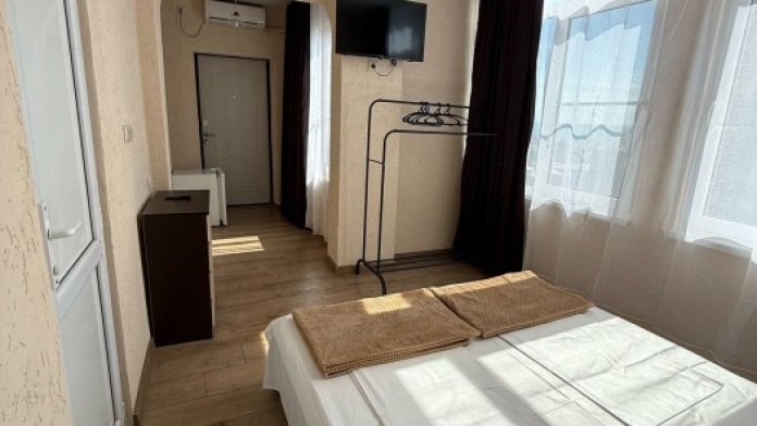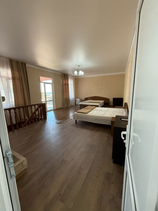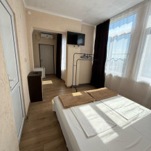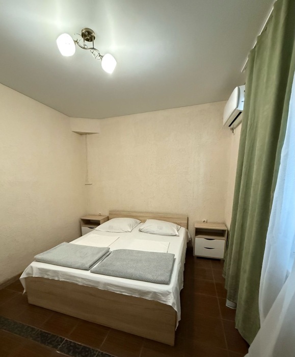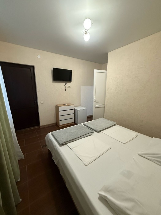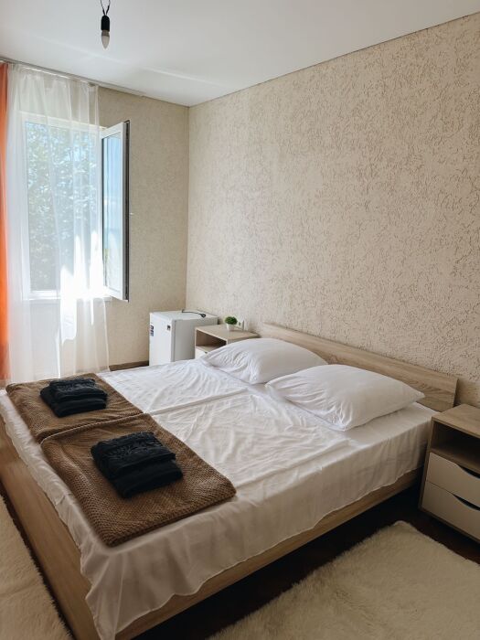 Комнаты в основном с видом на море и на горы. В комнатах: кровати, тумбочки прикроватные, комод для одежды, напольная вешалка, зеркало, кондиционер, холодильник, фен. Приём пищи только на летней кухне. Недалеко от дома есть столовые и кафе.