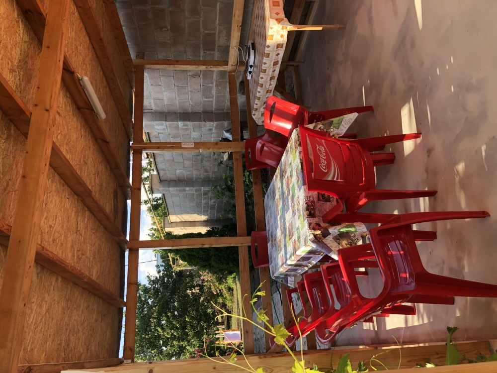 В доме на первом этаже кухня, санузел с душевой кабиной, гостиная с выходом в сад.