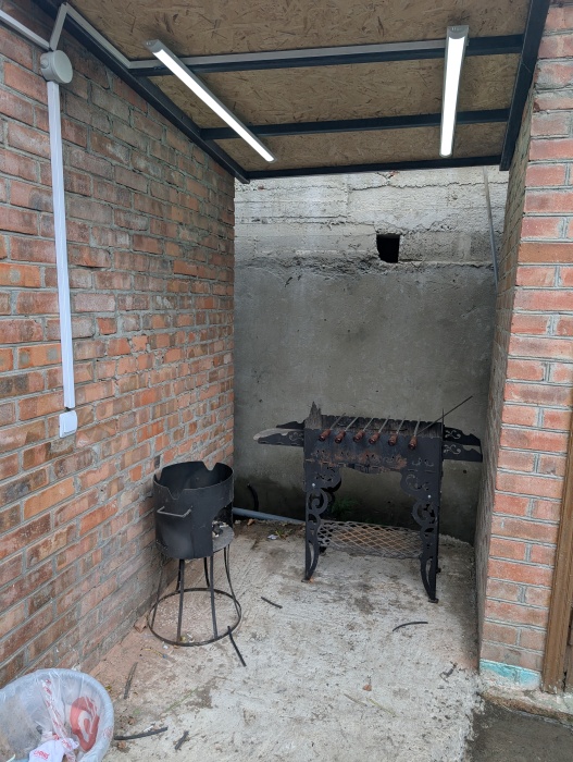 На придомовой территории есть мангальная зона отдыха, где можно пожарить шашлыки и посидеть вечером в саду, есть свет, столы с барбекю и туалет с душем, рядом находится зона стоянки для машин.