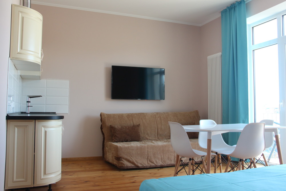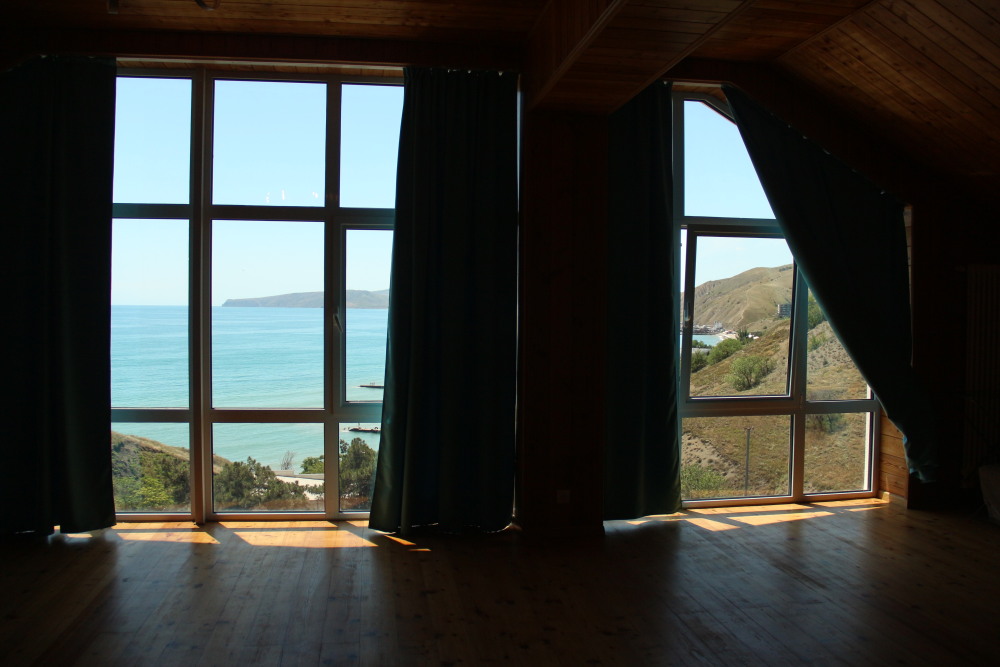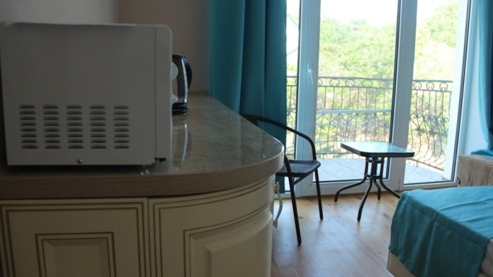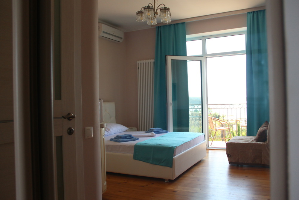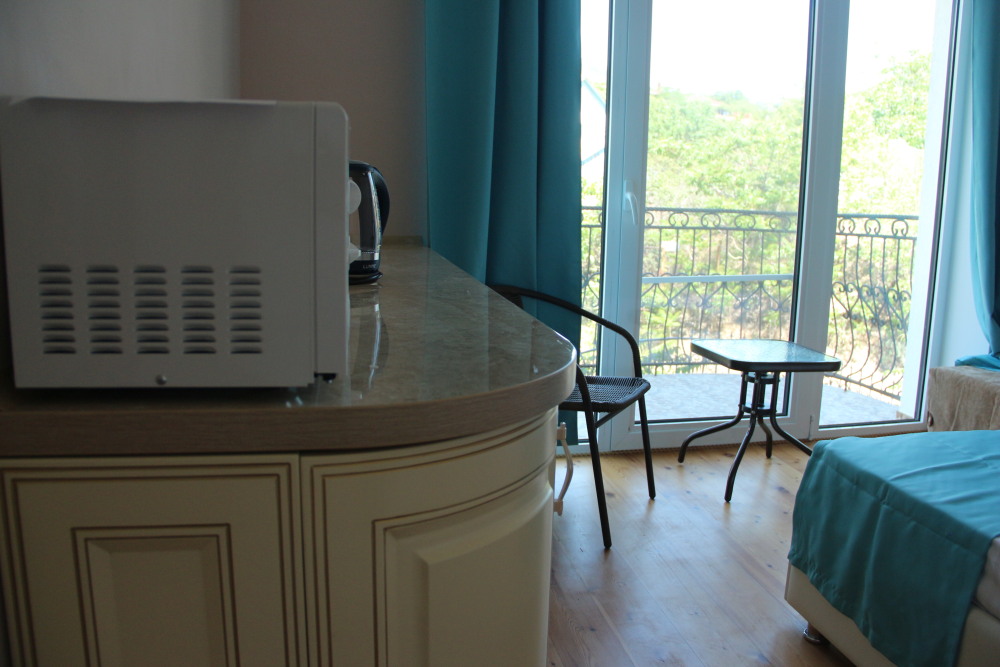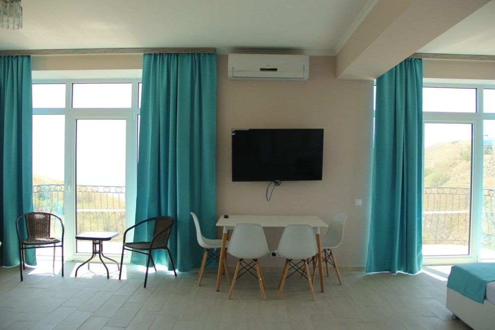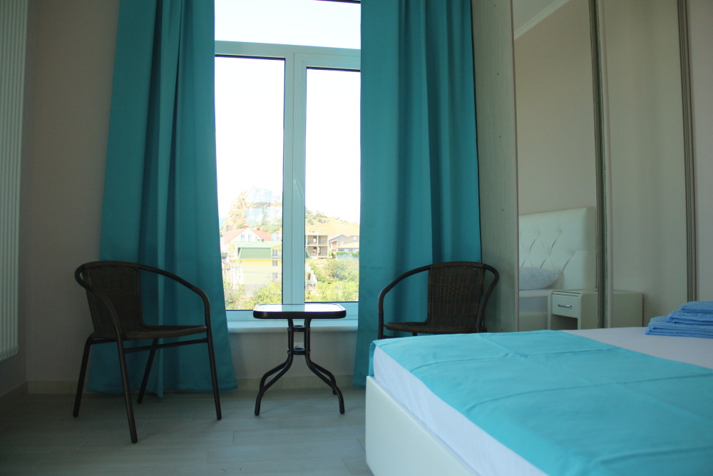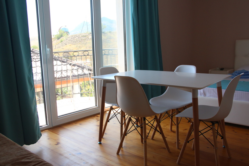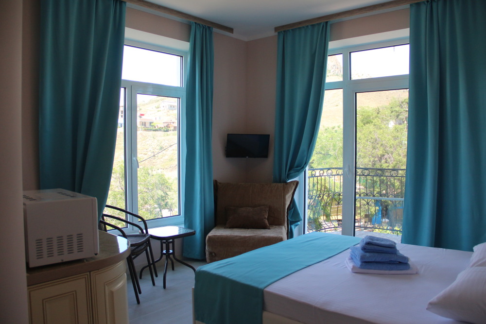Огромный номер с видом на море и знаменитый Кара-Даг. Имеется ванная, полноценная кухня и отличная новая мебель. Постройка 2021 года, идеальное состояние. Море видно из всех окон и двух балконов.