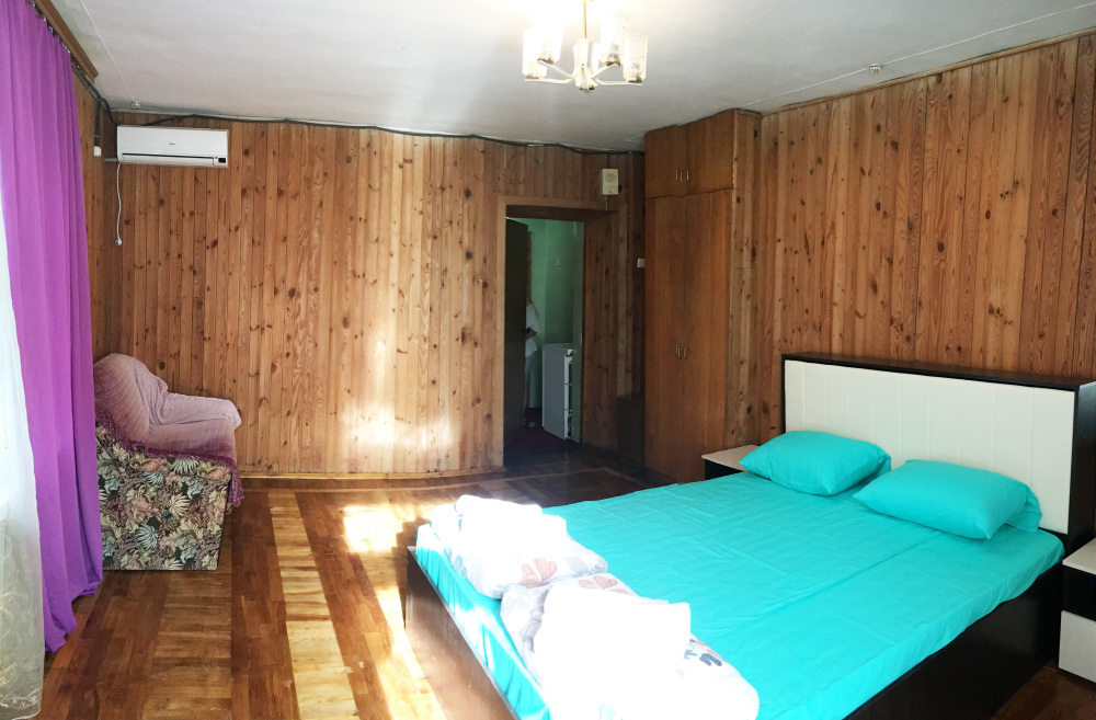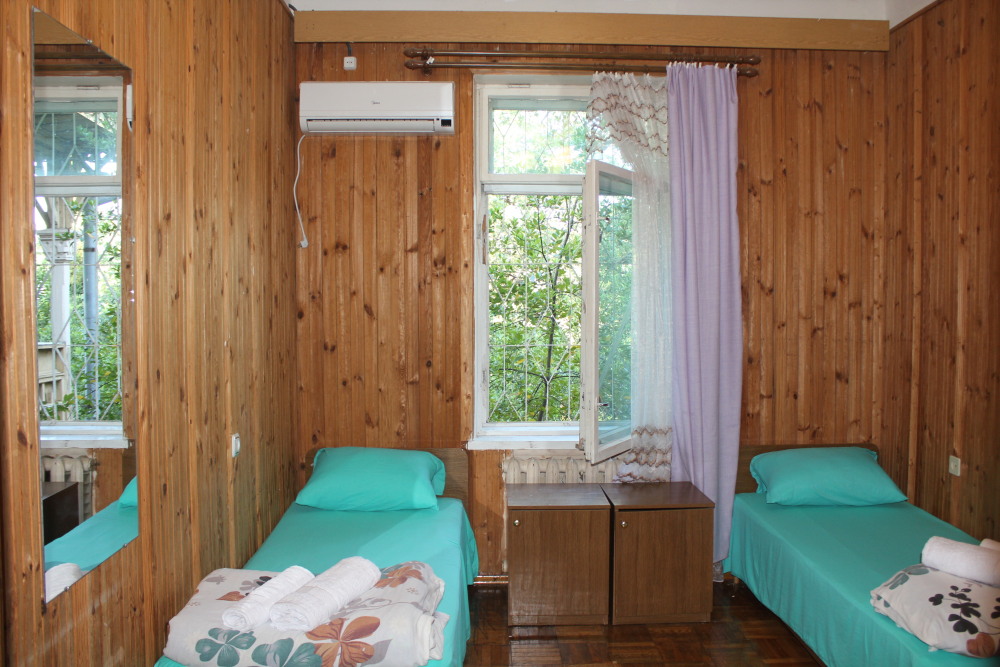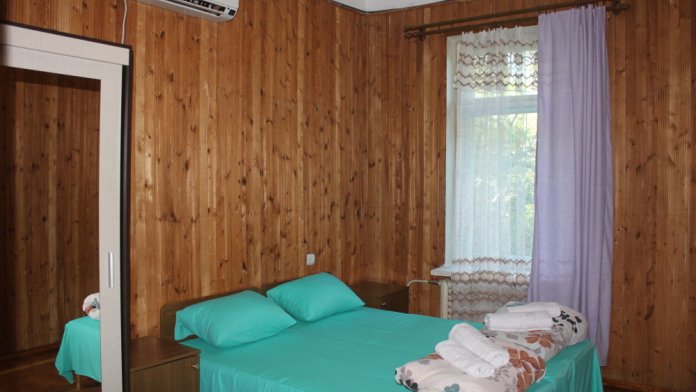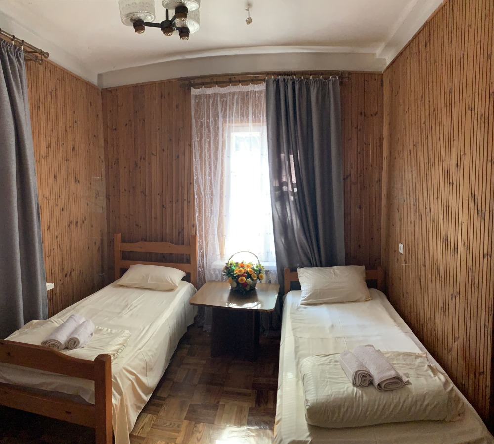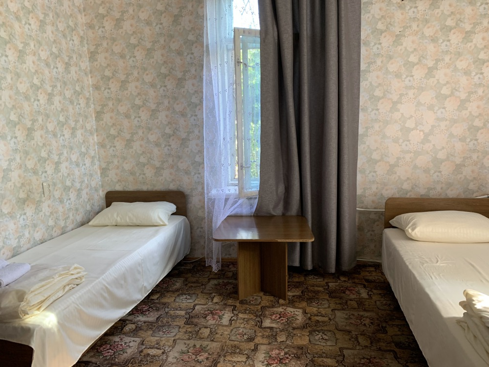 Номер состоит из двух раздельных комнат и одного санузла. Расположен на втором этаже двухэтажного здания. В номере 4 односпальных кровати, по две кровати в каждой комнате. В каждой комнате шкаф, телевизор, тумбочка, зеркало, кондиционер. Санузел совмещен. Душ раковина унитаз. Предоставляется постельное белье, полотенца, тапочки, шампунь, мыло.