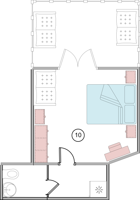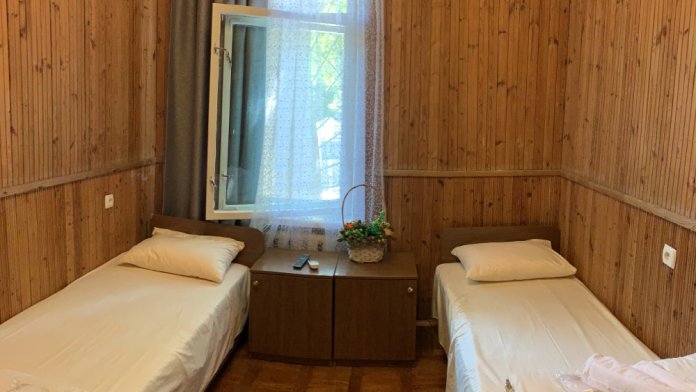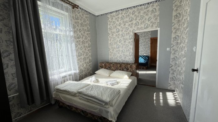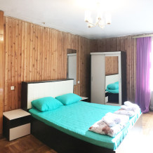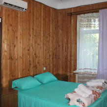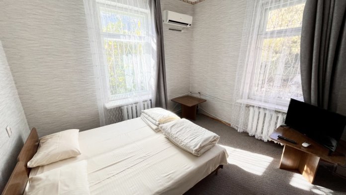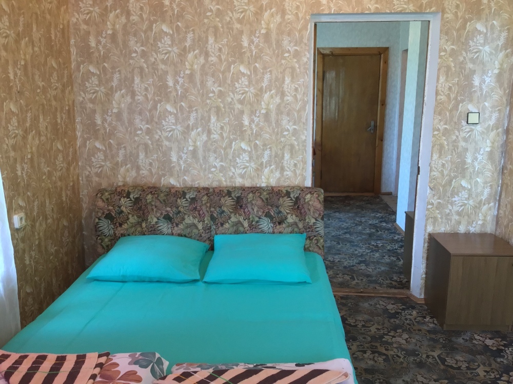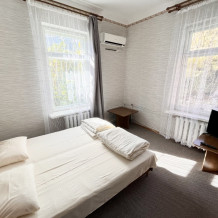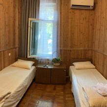 Двухкомнатный 3-местный номер. В одной комнате две односпальные кровати, в меньшей комнате одна односпальная кровать. В номере телевизор, холодильник, кондиционер. Свежее постельное белье, полотенца, мыльные принадлежности.