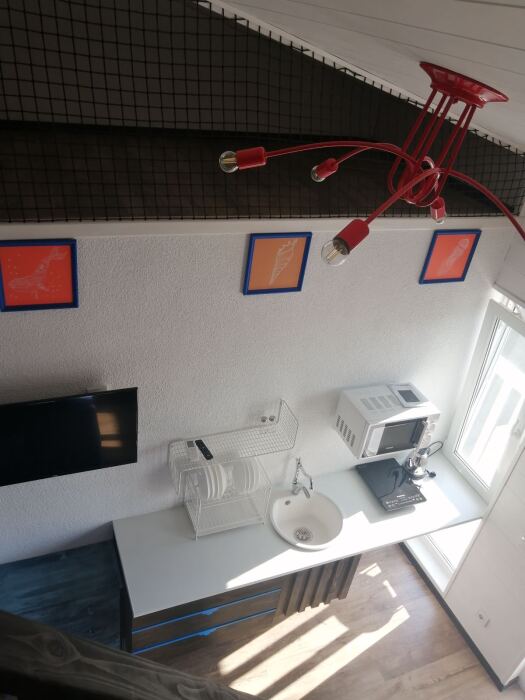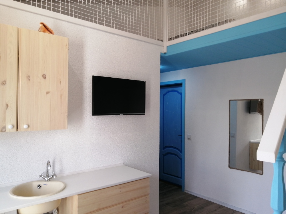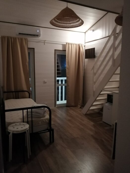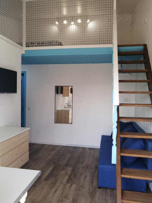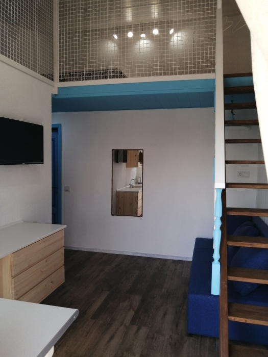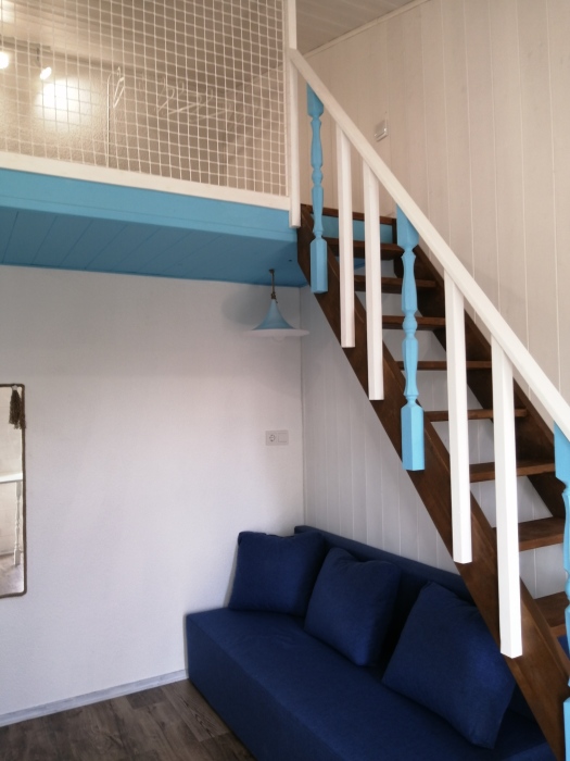 Для вашего комфорта в номере :кровать( 160*200см на антресольном этаже),диван-кровать,система хранения,мини-кухня с полной комплектацией посудой,индукционная плита,электрический чайник,мини-холодильник,СВЧ-печь.Санузел с душевым углом120*80см.Тв,wi-fi в номерах и по всей территории,кондиционер.