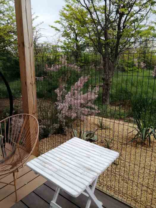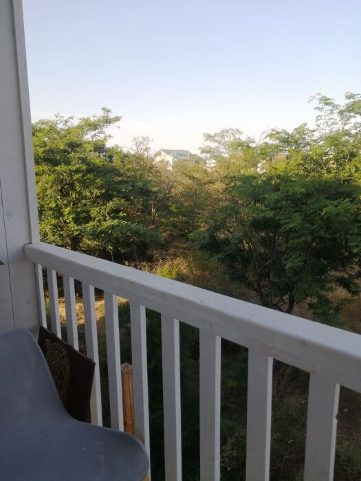 Окно выходит на лесополосу,что создает ощущение уединения и тишины.