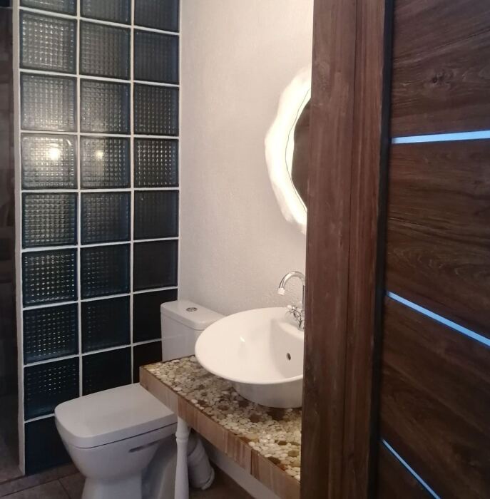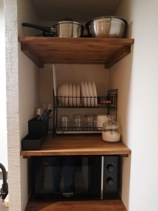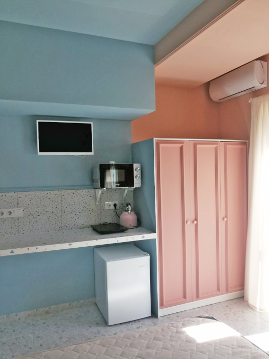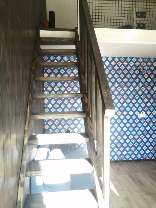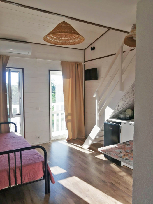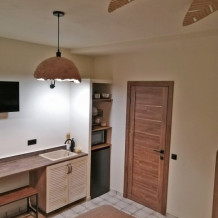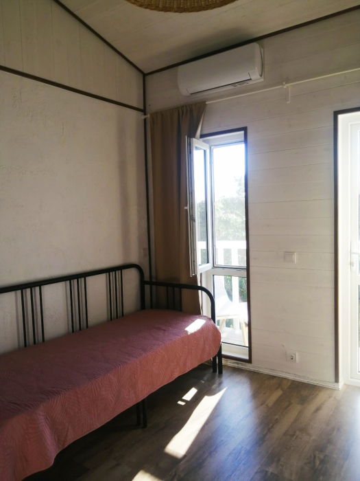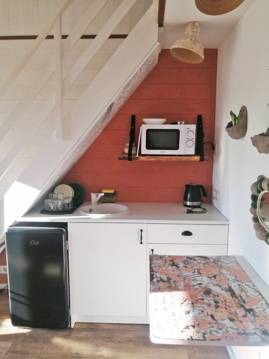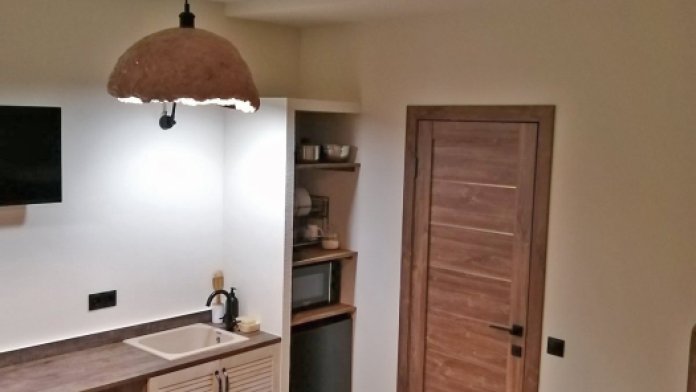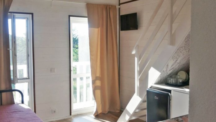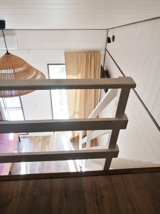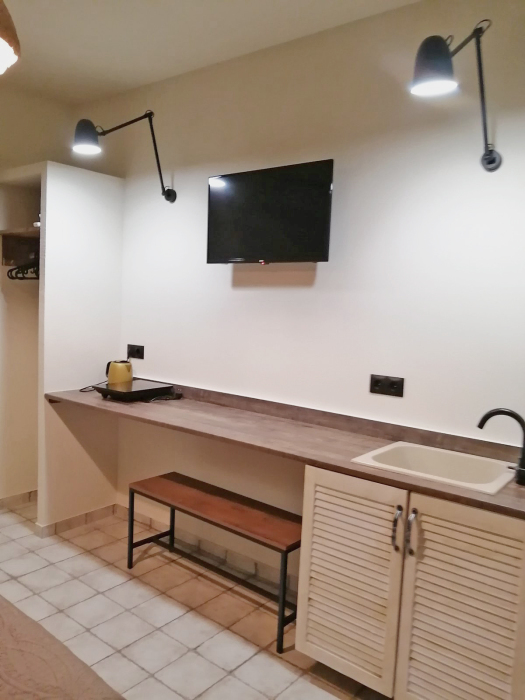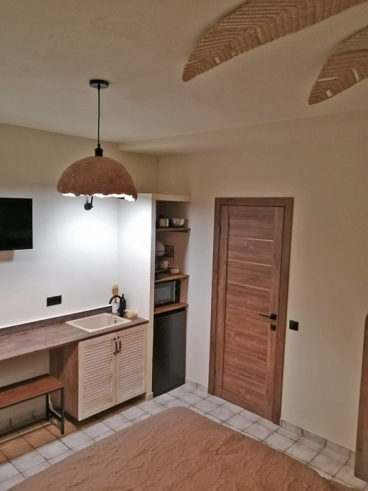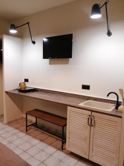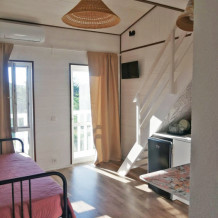 На данный момент доступны для бронирования 5 номеров,2 на первом этаже с террасой перед номером и 3 номера с антресольным этажом и балконом. В каждом номере мини-кухня. Полностью укомплектована посудой, индукционная плита, раковина. По функционалу номера рассчитаны на 2 взрослых +2 ребенка.