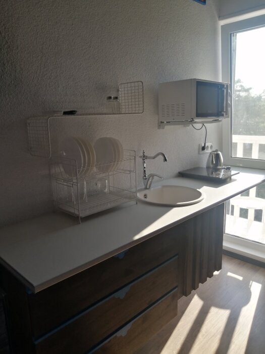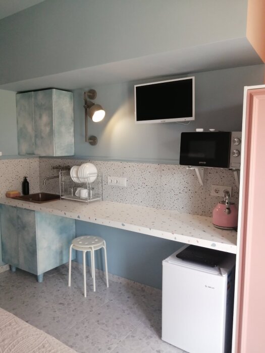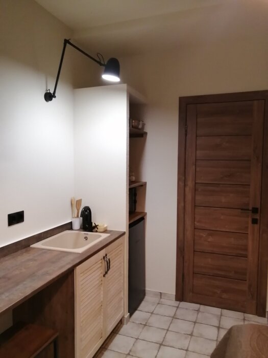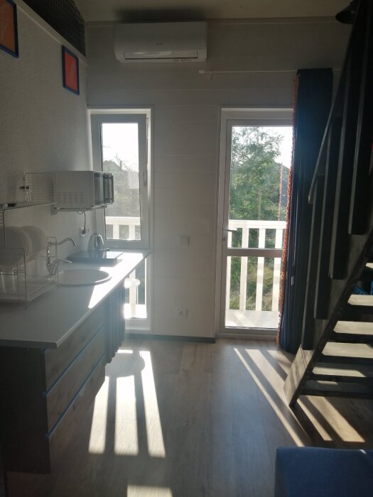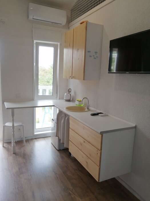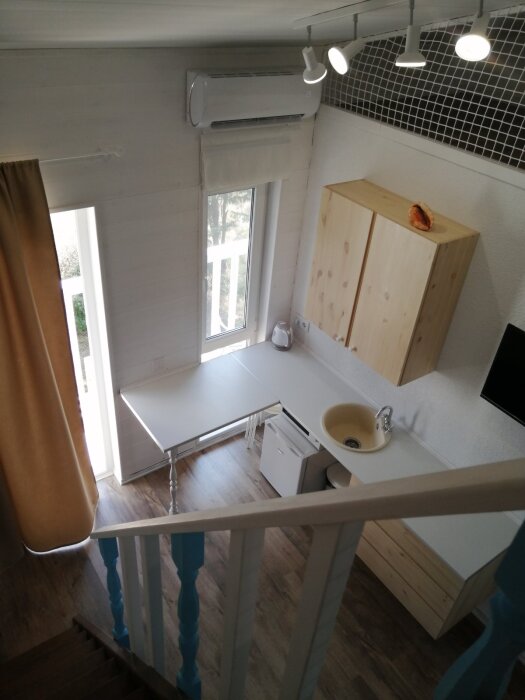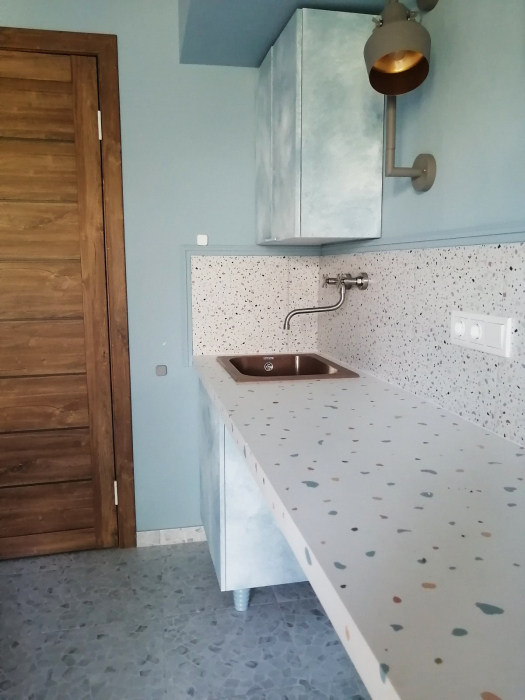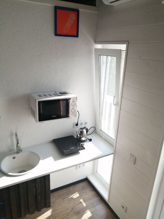 Комфортная небольшая зона кухни ,позволит легко приготовить завтрак, выпить чашку кофе и т.д. Не выходя в общее пространство.