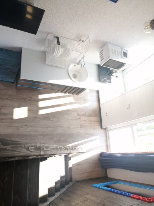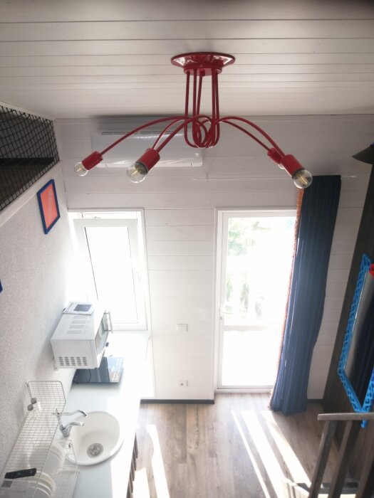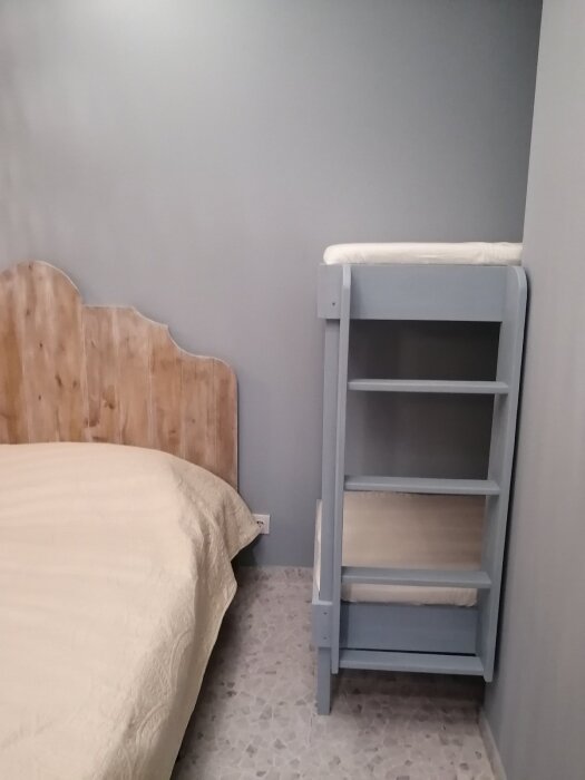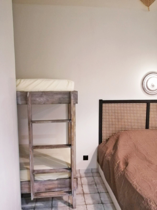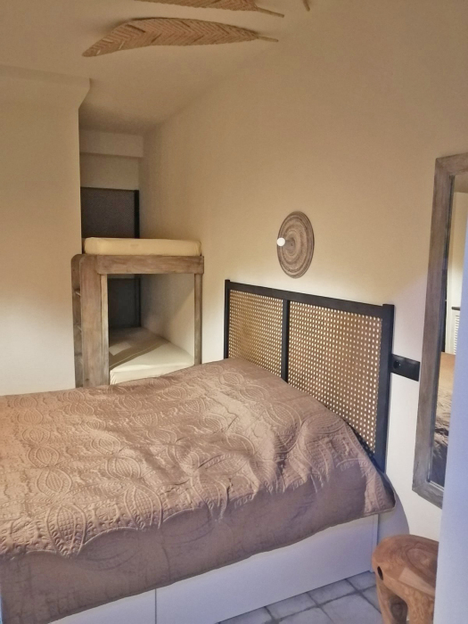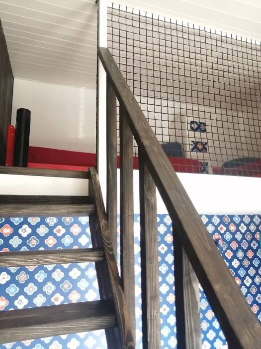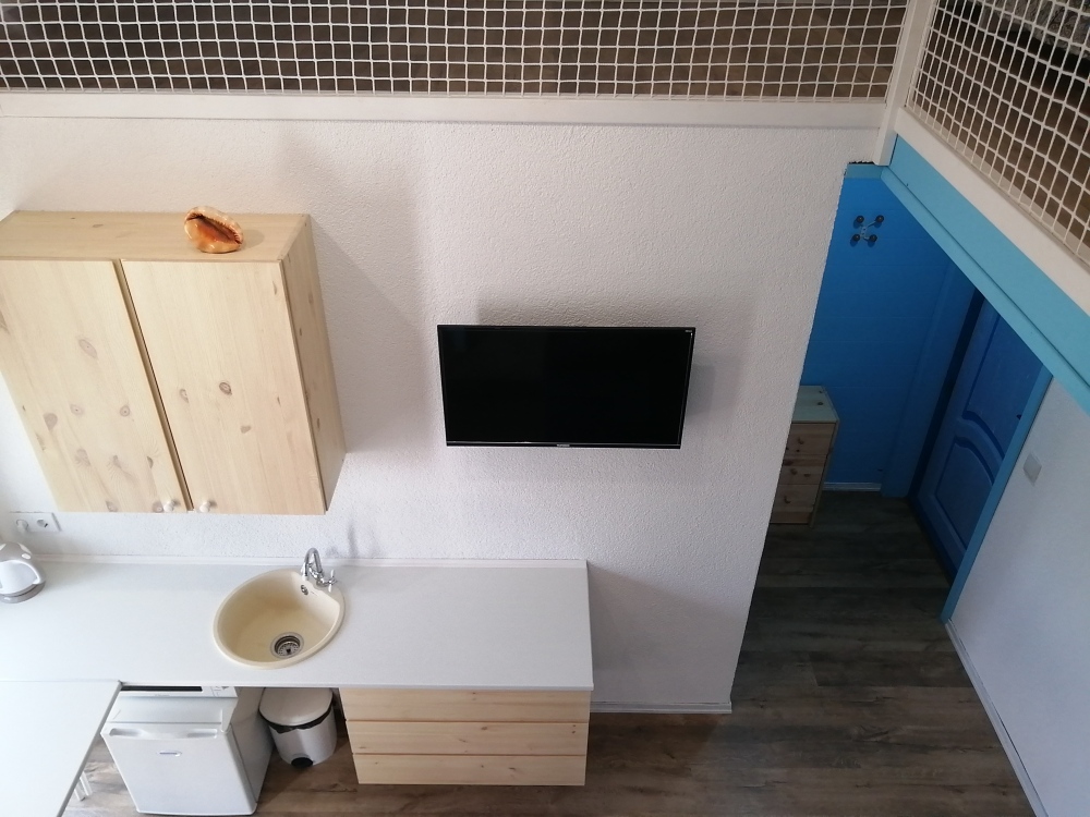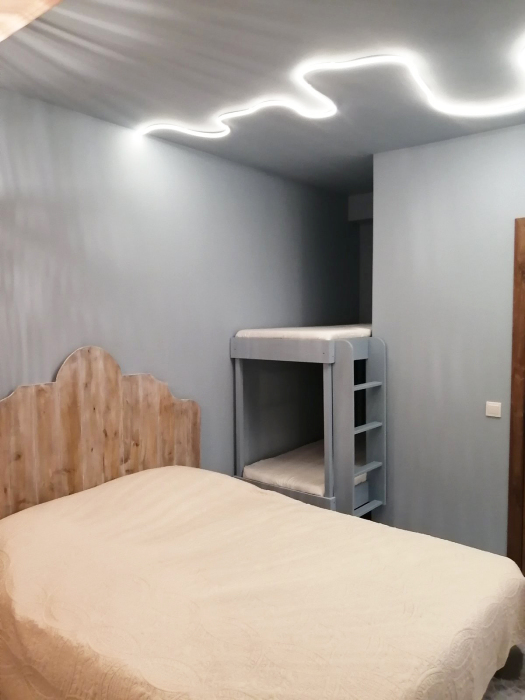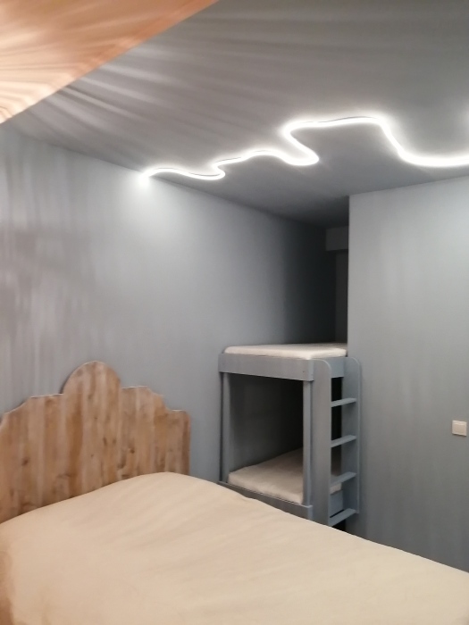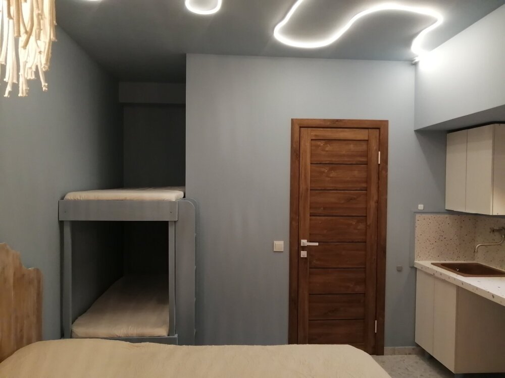 В номере большая кровать 160*200 и двухъярусная кровать .Небольшая ,но комфортная зона кухни. Полностью укомплектованная посудой ,индукционная плита, раковина.