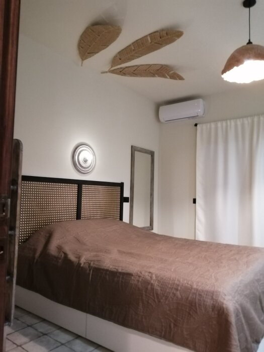 Номер «Бали «в теплой ,окутывающей цветовой гамме. С использованием в отделке большого количества дерева. Стилизованные плетеные листья спадают над кроватью словно балдахин.