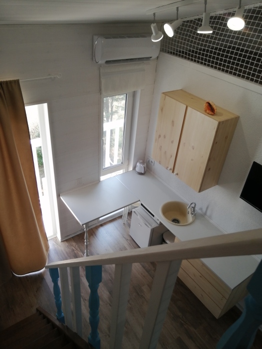 Для вашего комфорта в номере :кровать( 160*200см на антресольном этаже),кушетка-кровать(160*200см),система хранения,мини-кухня с полной комплектацией посудой,индукционная плита,электрический чайник,мини-холодильник,СВЧ-печь.Санузел с душевым углом 80*80см.Тв,wi-fi в номерах и по всей территории,кондиционер.