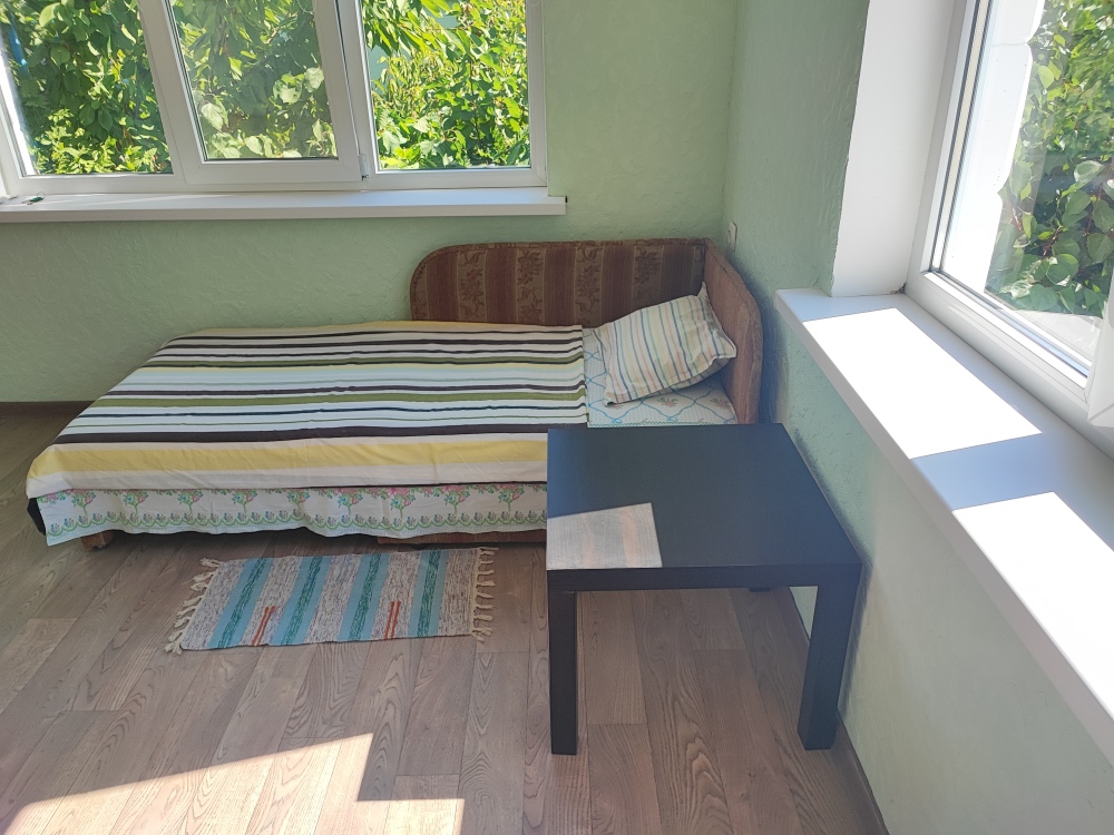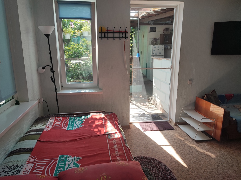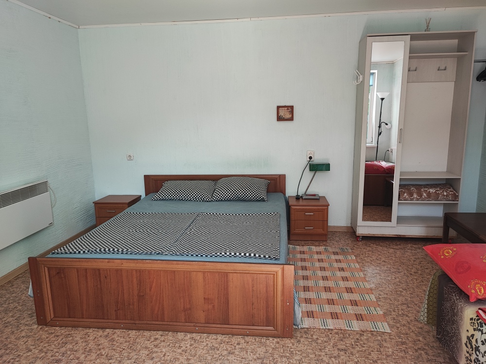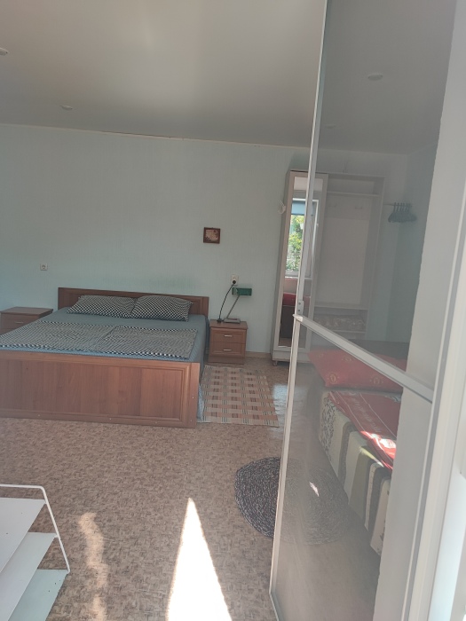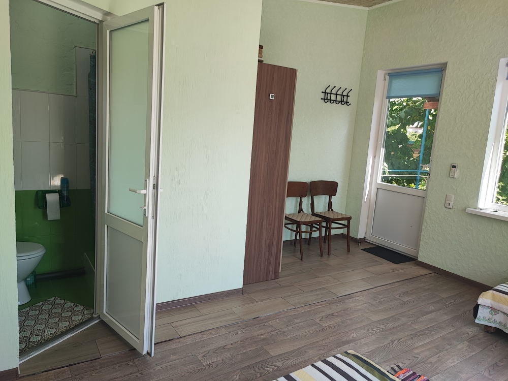 На первом этаже расположена комната с большой двухспальной кроватью, односпальным раскладным диваном и раскладным мини-диваном. Также в комнате, на первом этаже есть телевизор со Smart TV и кондиционер. В каждом из номеров есть шкаф для вещей. На улице, возле комнаты, находится веранда с обустроенной кухней и холодильником. Рядом с номером расположен совмещенный душ с туалетом и отдельный туалет. Помимо всего прочего на территории дачи есть мангальная зона со всем необходимым для готовки. Кстати,окна номера оснащены защитой от ультрафиолетовых лучей.