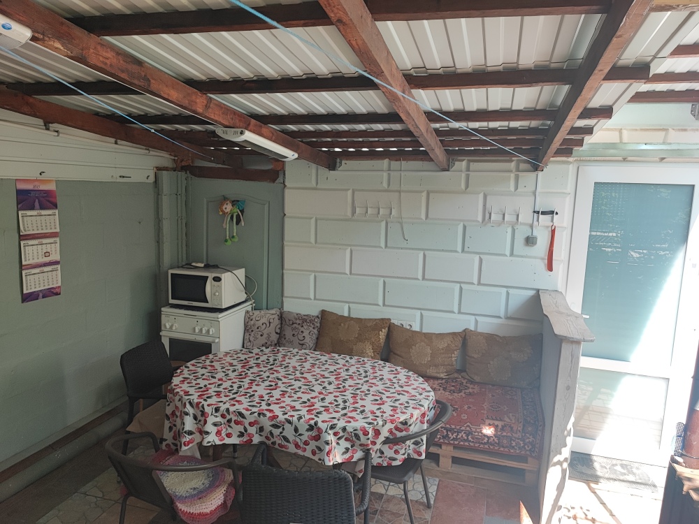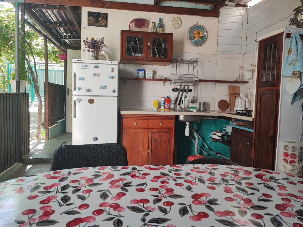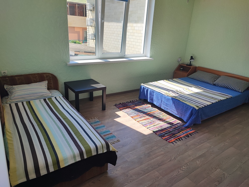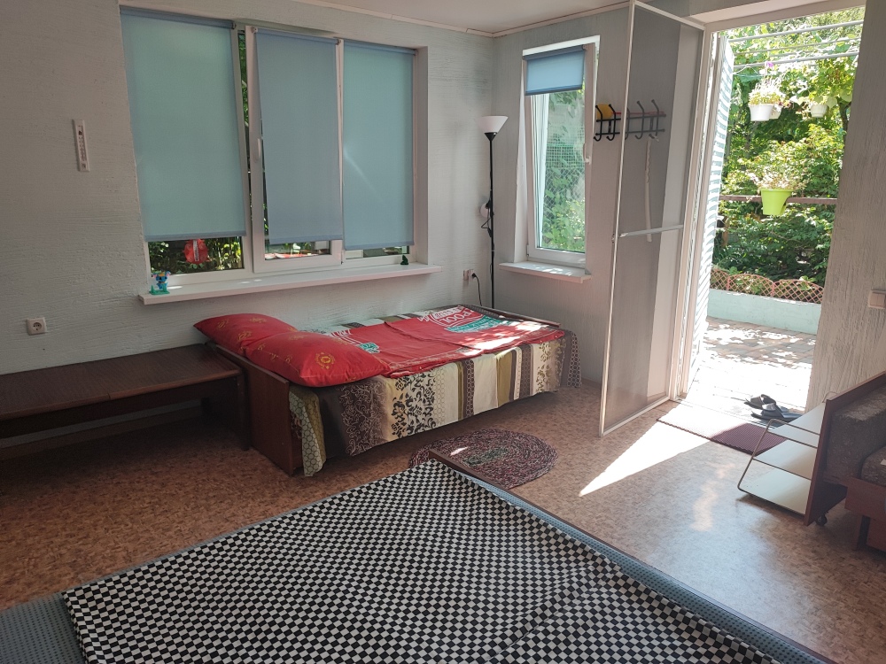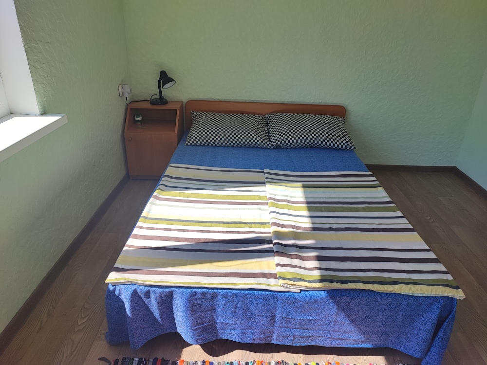 На первом этаже расположена комната с большой двухспальной кроватью, односпальным раскладным диваном и раскладным мини-диваном. Также в комнате, на первом этаже есть телевизор со Smart TV и кондиционер. В каждом из номеров есть шкаф для вещей. На улице, возле комнаты, находится веранда с обустроенной кухней и холодильником. Рядом с номером расположен совмещенный душ с туалетом и отдельный туалет. Помимо всего прочего на территории дачи есть мангальная зона со всем необходимым для готовки. Кстати,окна номера оснащены защитой от ультрафиолетовых лучей.