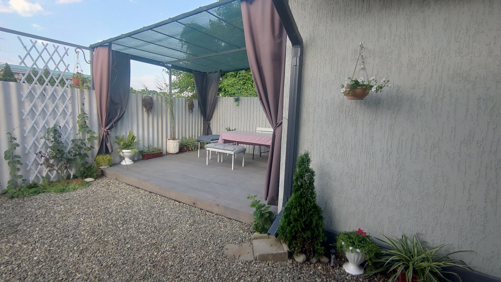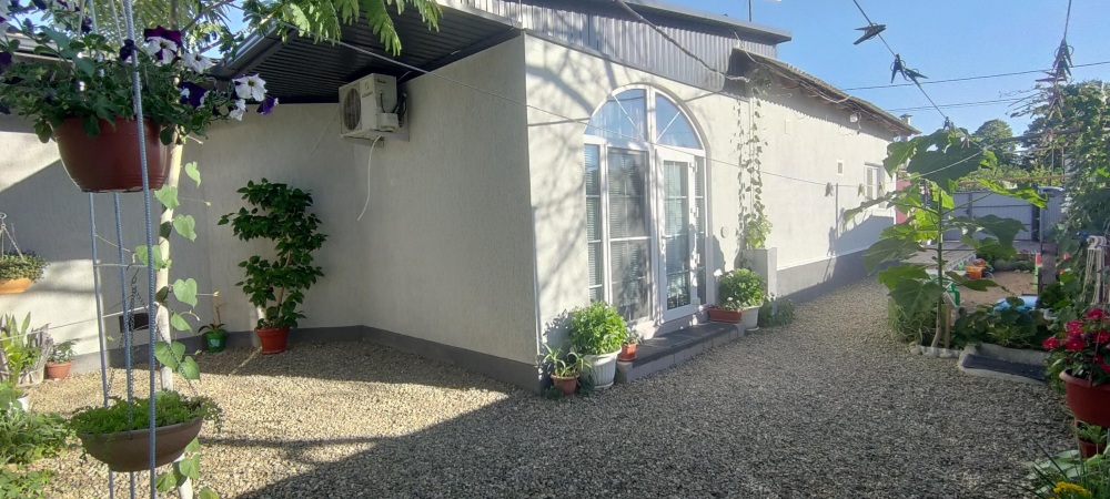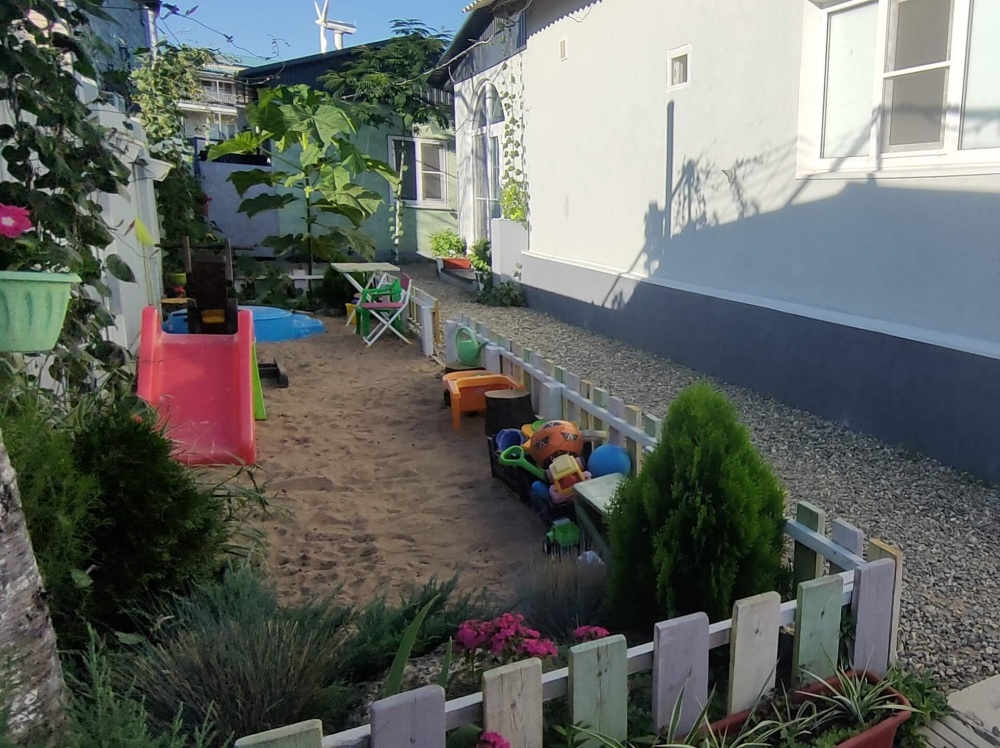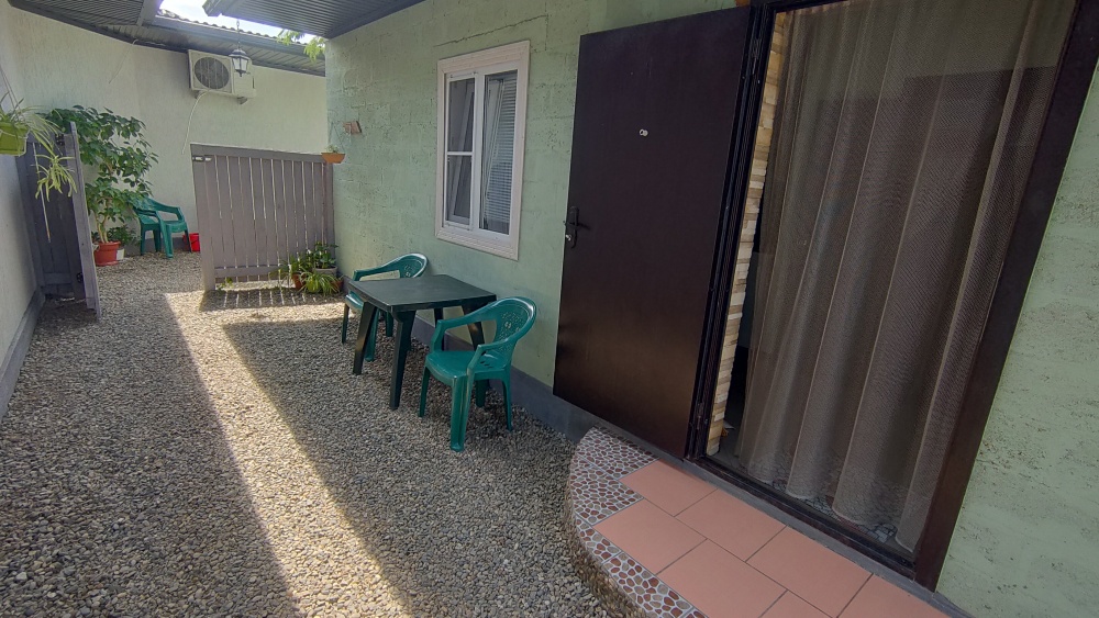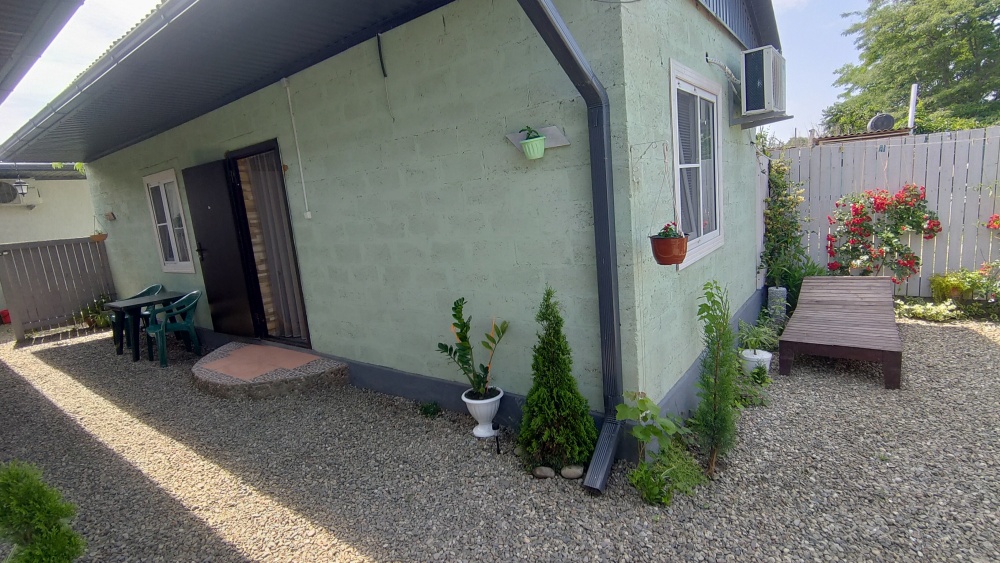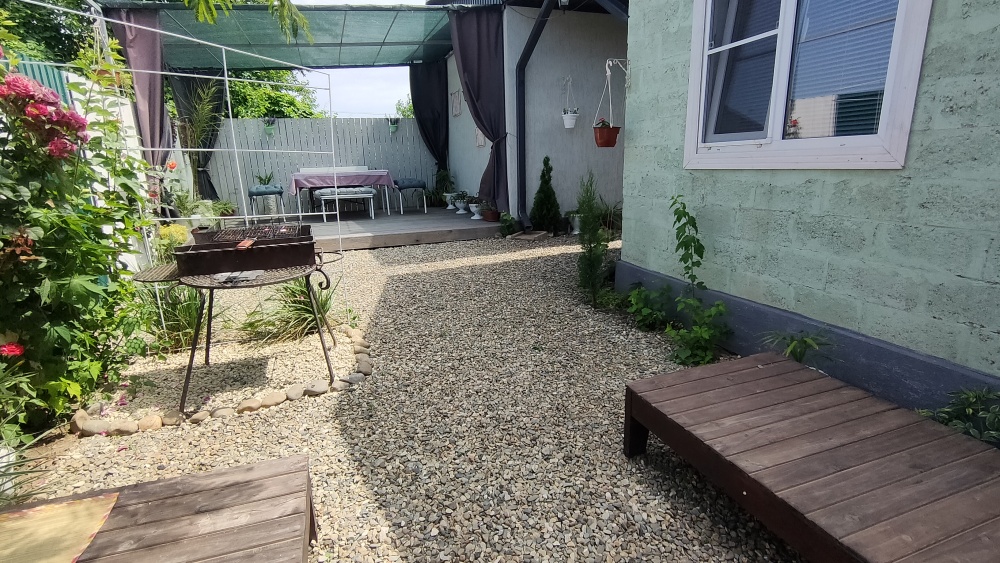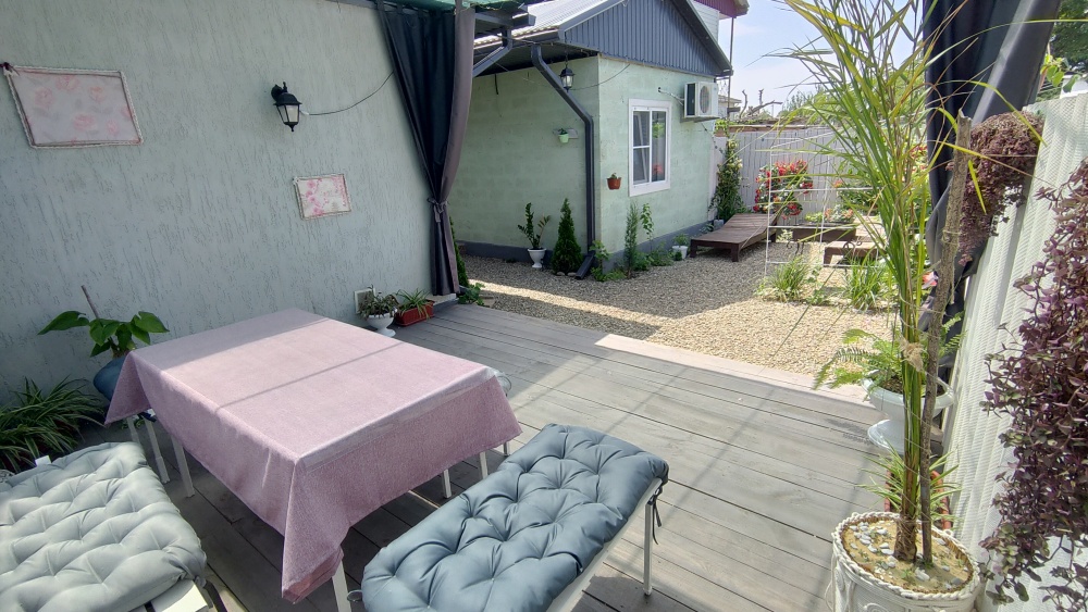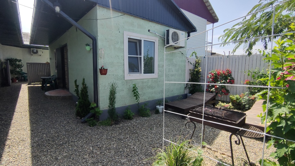 Во дворе для удобства гостей имеется летний столик с зонтом для времяпрепровождения, автостоянка. Двор дома в тени деревьев и виноградной лозы. Есть мангал, песочница, качеля.