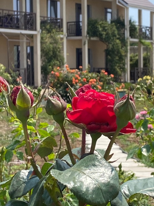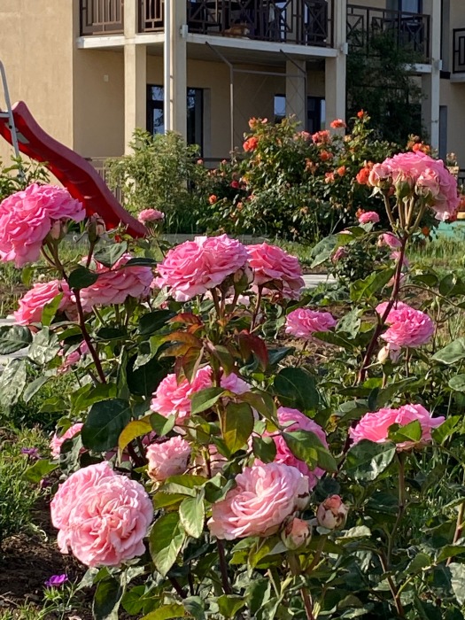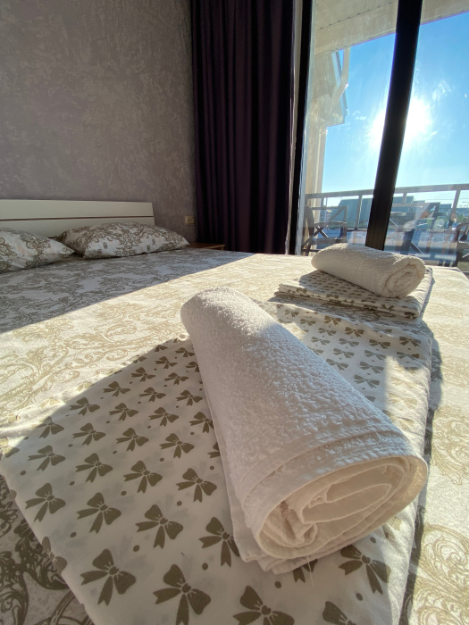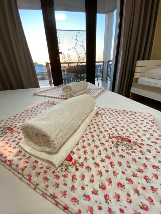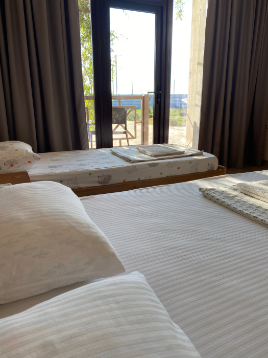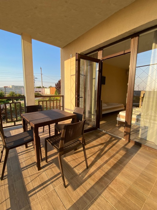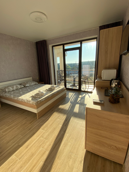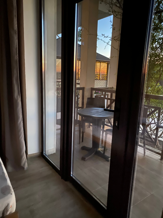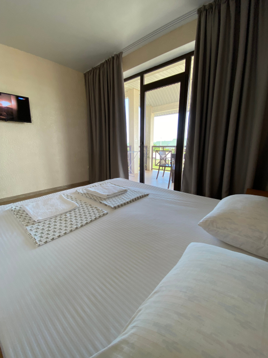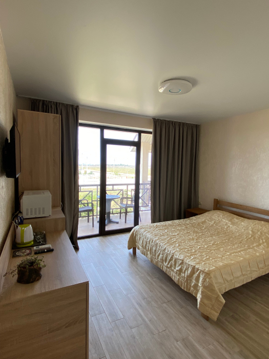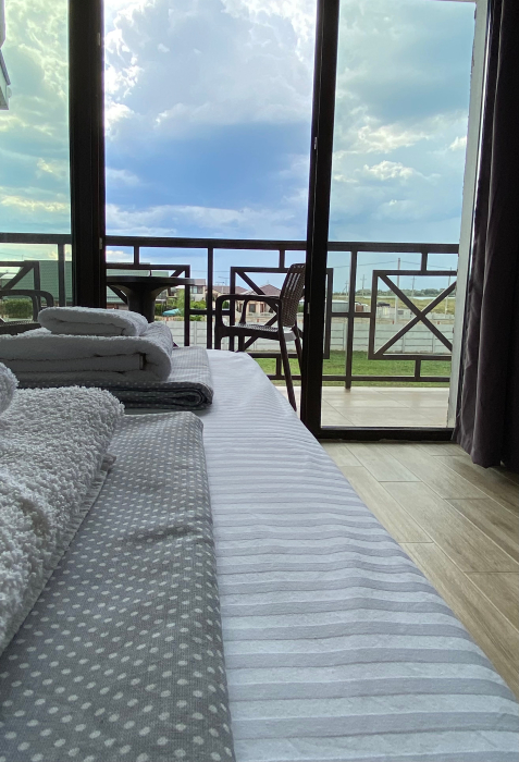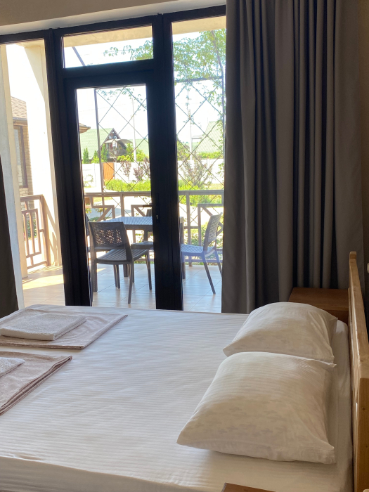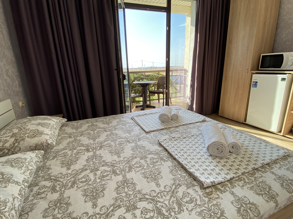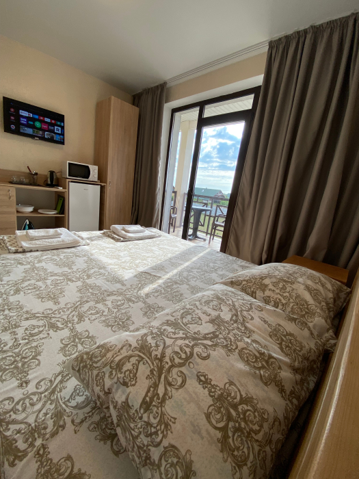 Все номера имеют уютную террасу, оборудованную креслами и столиками, где на свежем воздухе можно приятно провести утреннее либо вечернее время. С балконов номеров второго этажа открывается частичный вид на море.