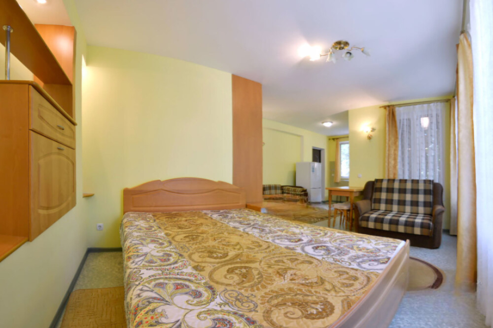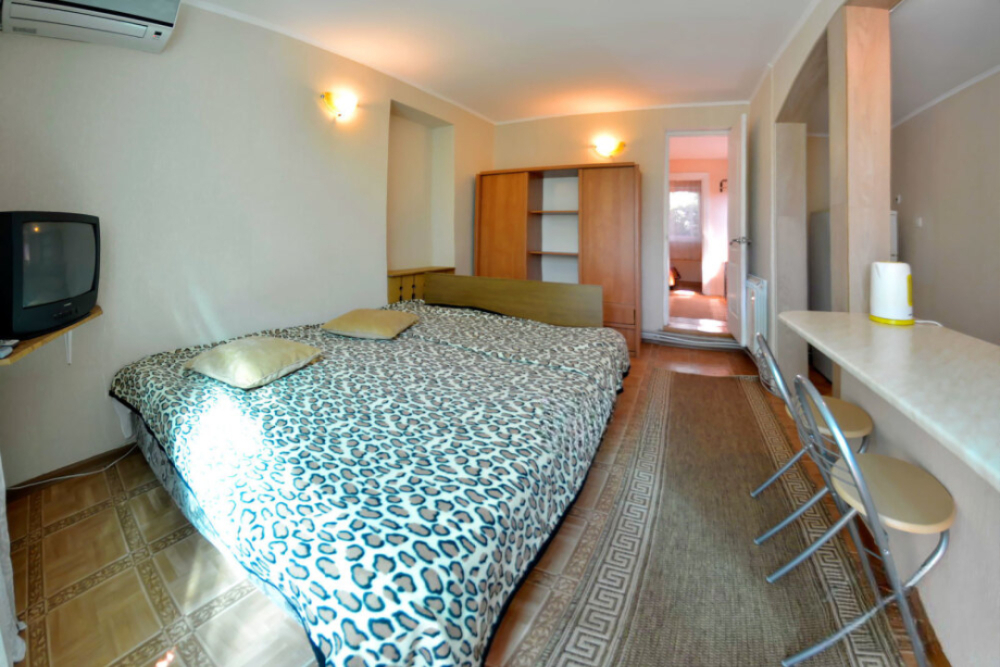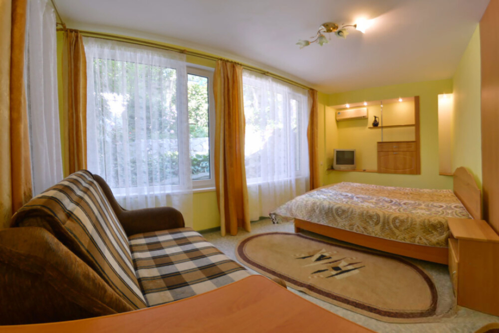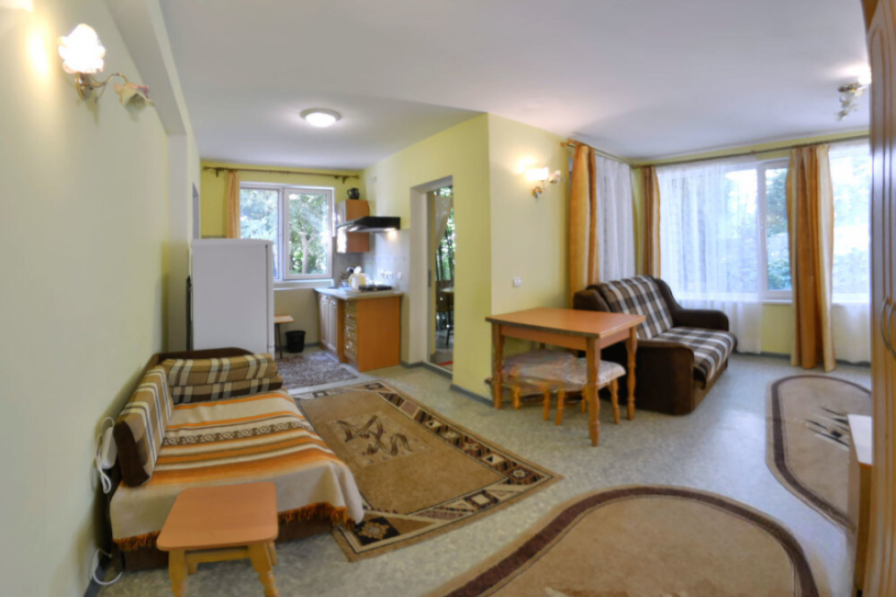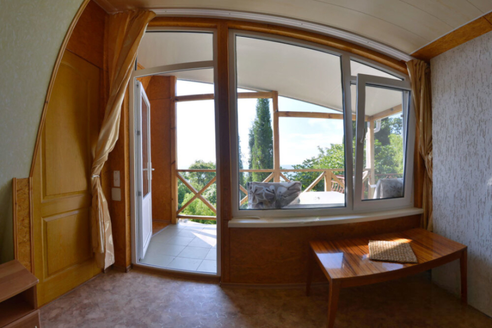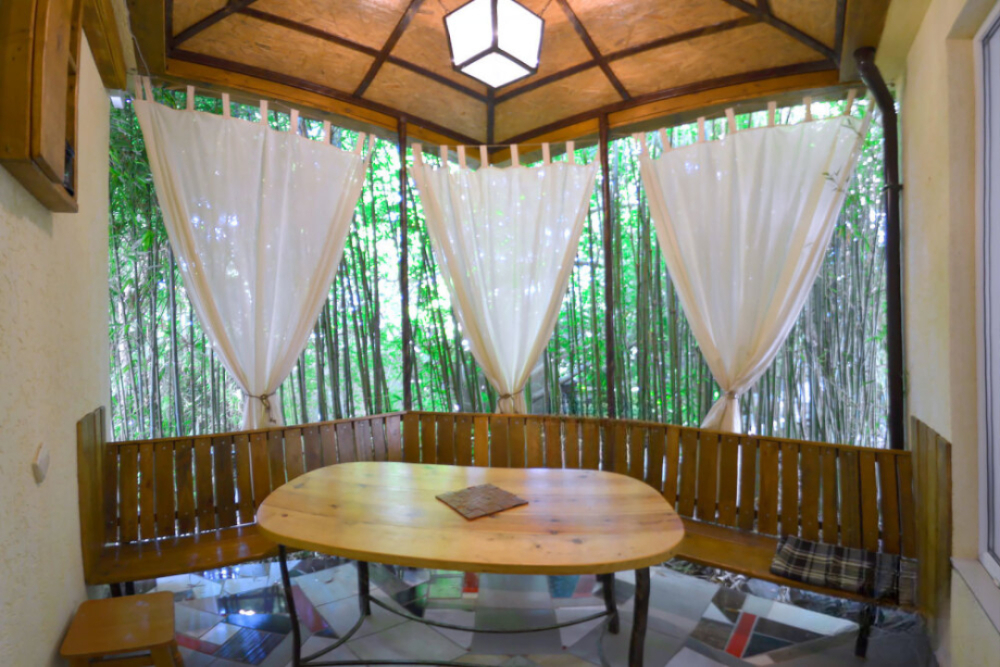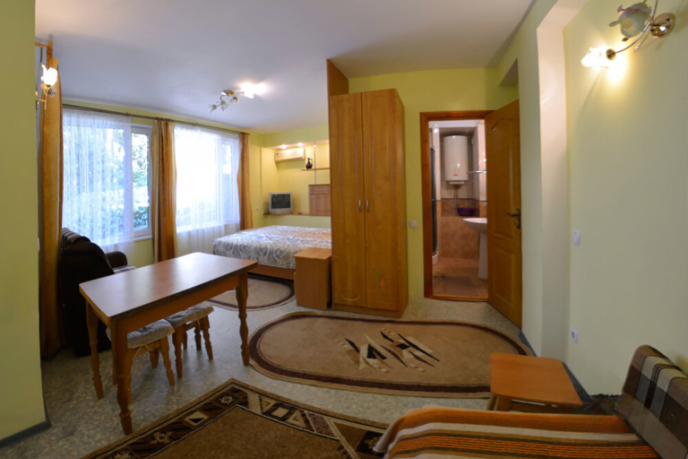 В номере есть все необходимое для курортного отдыха. Возле номера крытая Терраса с кухней и обеденной зоной. Окна выходят в сад. Прохладно и зелено.