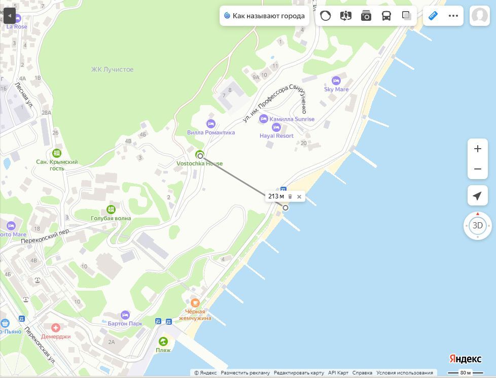 Частный дом «Vostochka Нouse» в самом городе Алушта (15 мин. пешком от центра), в начале восточной набережной, к Семидворье относимся только почтовым адресом. До моря 200 м. До пляжа 260 м. по лестнице или 400 м. по асфальтированной дороге. Парковка возле дома (камеры). До центра Алушты 15 минут ходьбы. До центральной набережной 600 м. До ж/д вокзала г. Симферополь 40 км. Все расстояния реальные, смотрим Яндекс карту. Рядом находятся парк-отель «Порто-Маре», пансионат «Голубая волна», Федеральный тренировочный центр сборных команд России «Крымский» (бывший стадион «Спартак»), приморский парк, дельфинарий «Немо».
