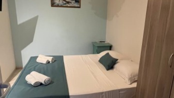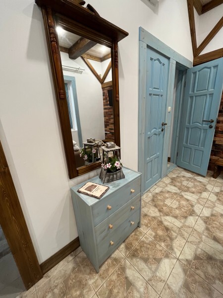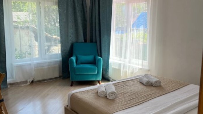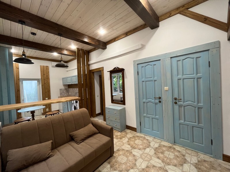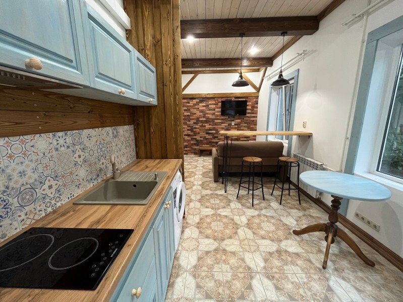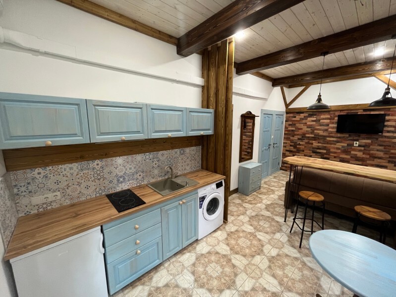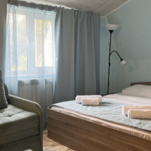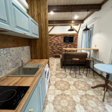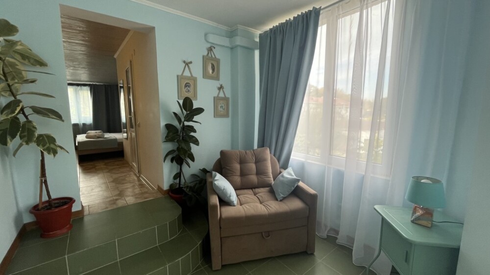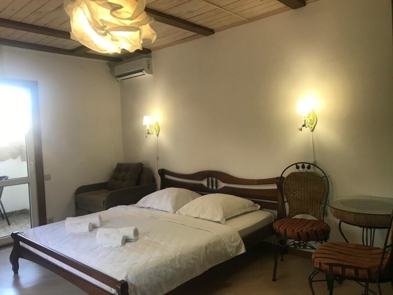 Апартаменты с отдельный входом. Две спальни - в одной спальне двуспальная кровать в другой две односпальные кровати, в гостиной двухместный раскладывающийся диван. Гостиная с кухней - двухкомфорочная плита, холодильник, чайник стиральная машина, барная стойка, стол, стулья). Душ, туалет, гардеробная.