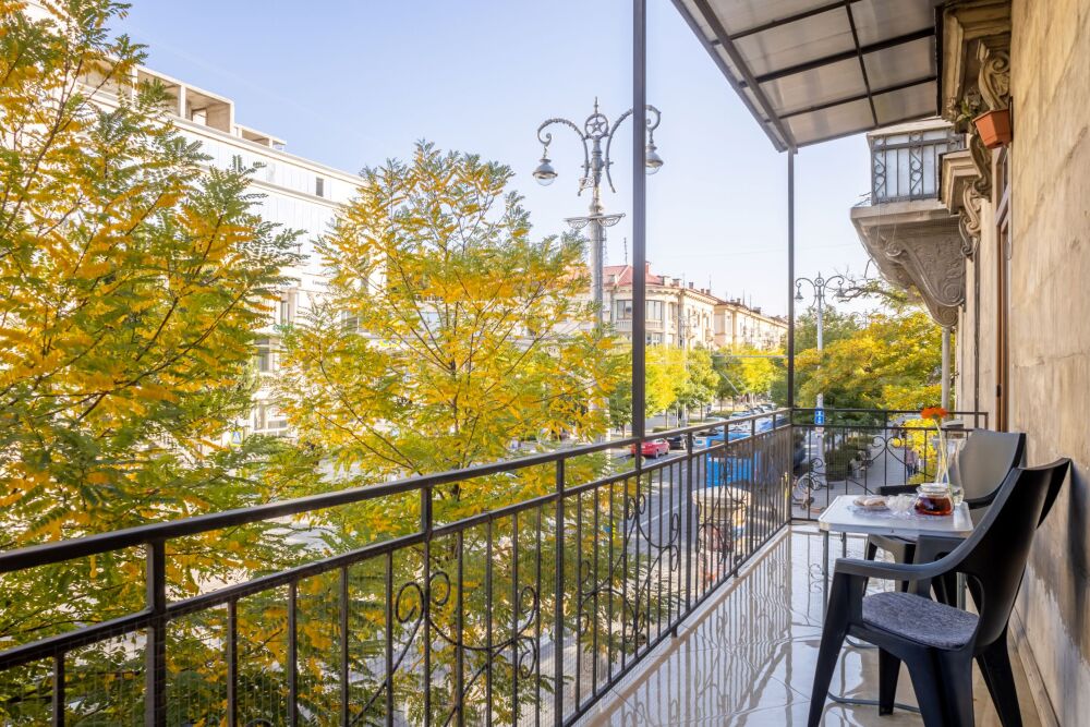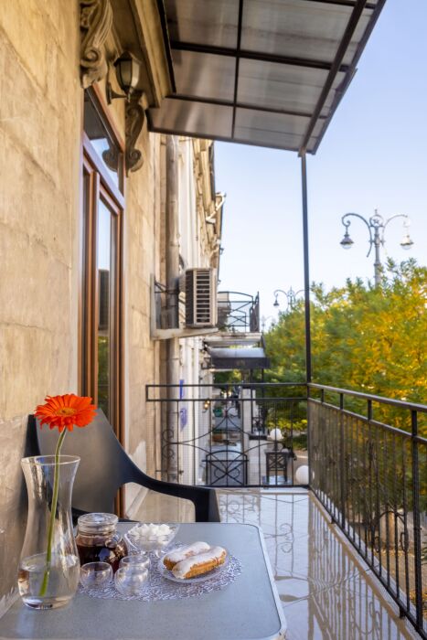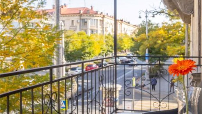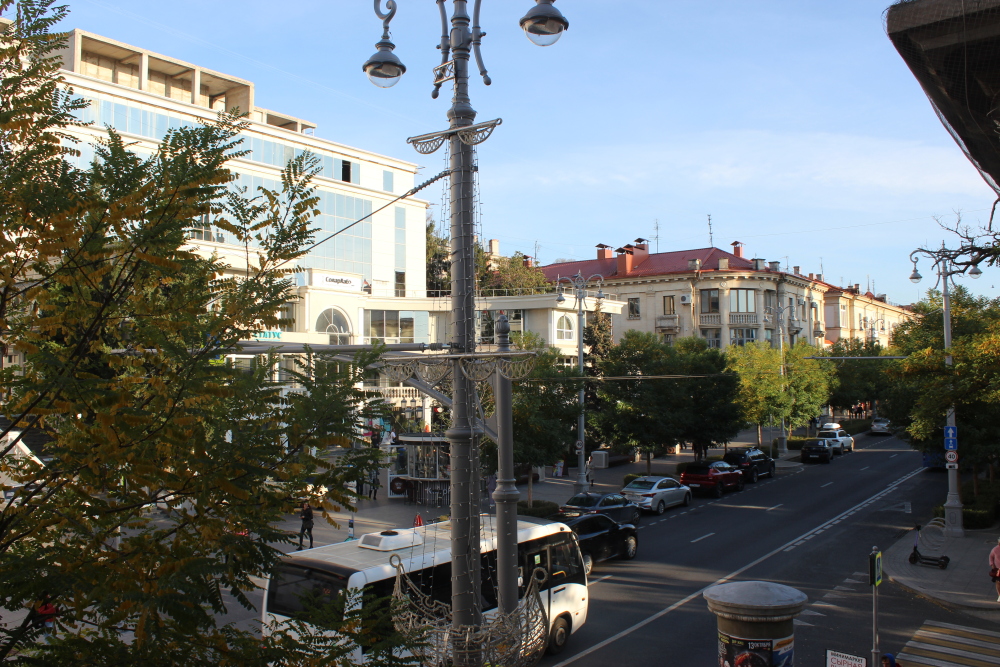 Шикарный балкон терраса с крутым видом на главную улицу города! А вид на вечерний город воистину потрясающий . Когда включается иллюминация и подсветка, получается особая магия Севастополя.